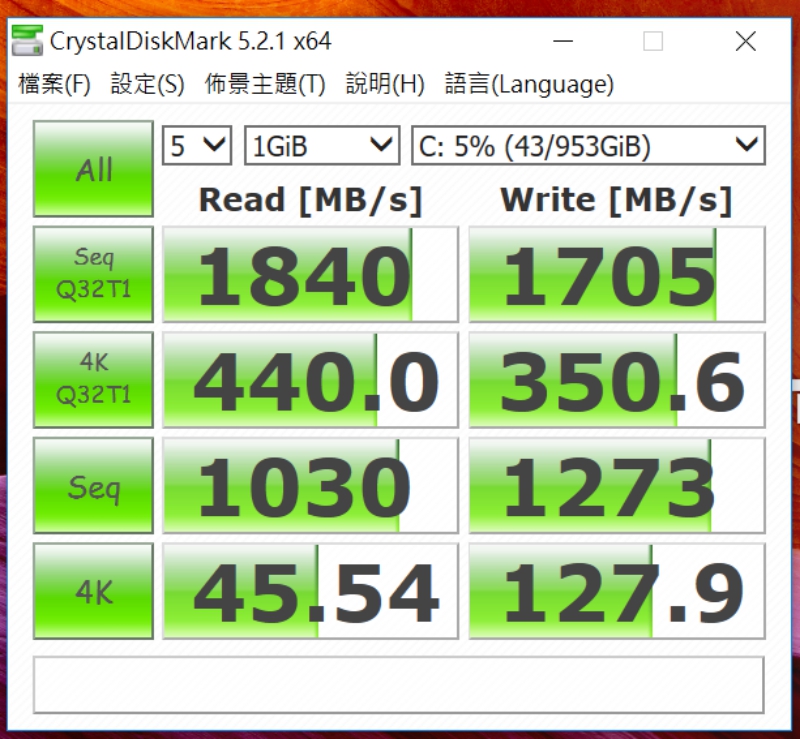 SSD 的部份,速度也不容小覷,不愧是採用 M.2 SSD,速度真的是飛快啊,且 1TB 的 SSD 容量,用起來真的是超爽 der。