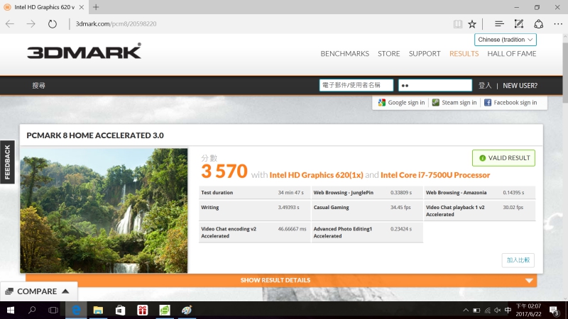 另外透過 PCMARK 8 的 HOME 模式測試,獲得 3570 的分數。