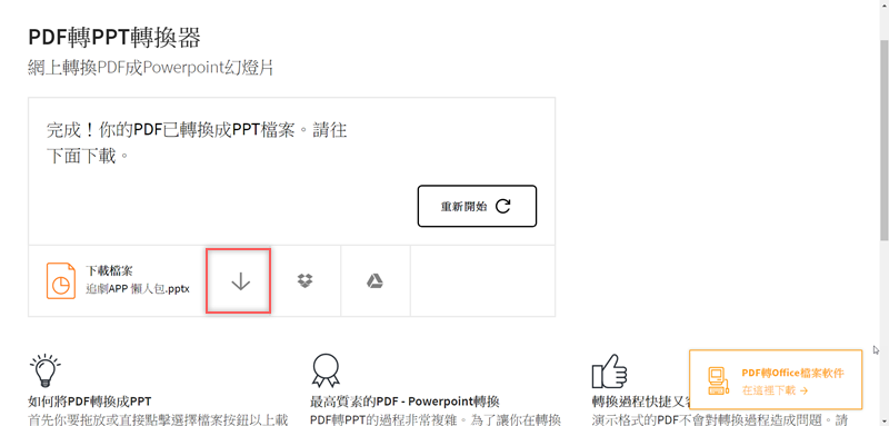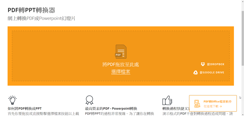 來試試 PDF 轉 PPT,可選擇電腦、雲端硬碟裡的檔案,包括常見的 DROPBOX、GOOGLE DRIVE,或直接拖進去就會自動轉檔,速度相當快大概不到 3 秒。