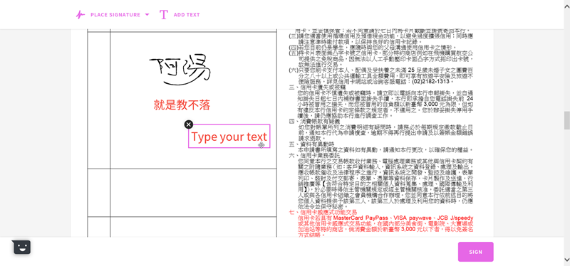 在預覽頁面可以選擇置入剛剛完成的簽名檔,或是點「T」用打的。