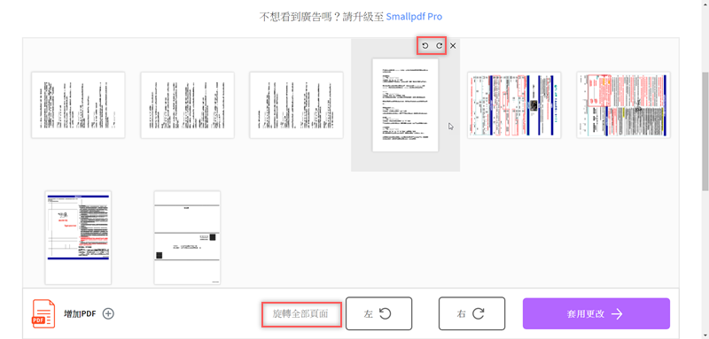 再來看旋轉 PDF,加入檔案後可每個頁面分別旋轉或全部旋轉,也能在左下角增加其他檔案。