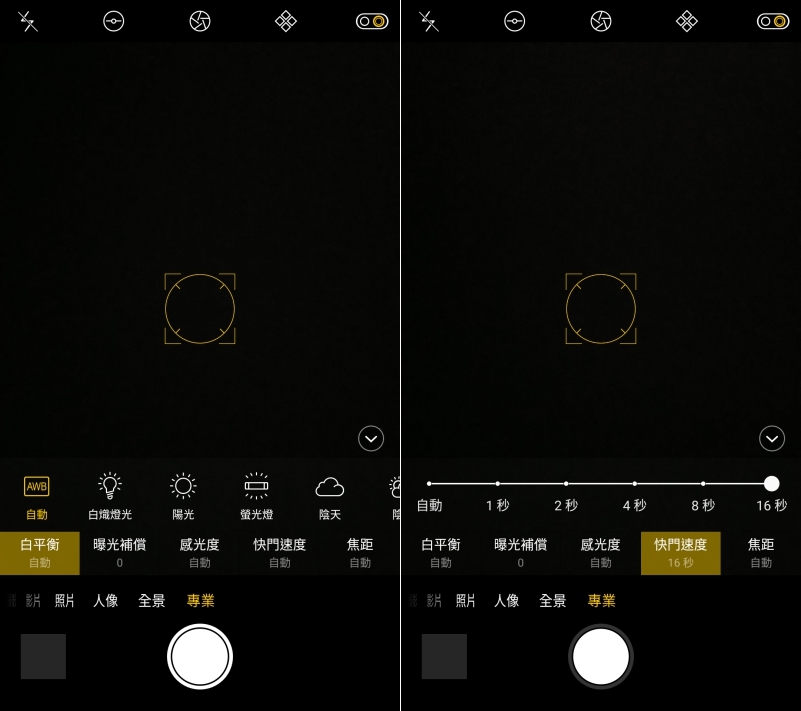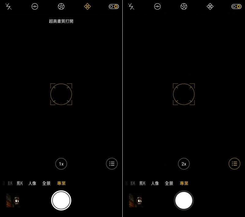 另外在專業模式下還有幾項重點功能,大家注意看上面,切換成專業模式後,上排最右邊二個圖示都分別是超高畫質模式以及切換雙主鏡頭的按鈕,在超畫質模式下可以拍攝出超高解析度 8000 萬像素的照片,拍完如果用電腦查看你就知道那細節會多驚人。