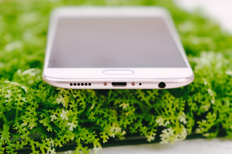 下方為喇叭、microUSB 連接埠且支援 VOOC 閃充,只要充電 5 分鐘就能夠通話 2 小時、降噪麥克風以及 3.5mm 耳麥孔。
