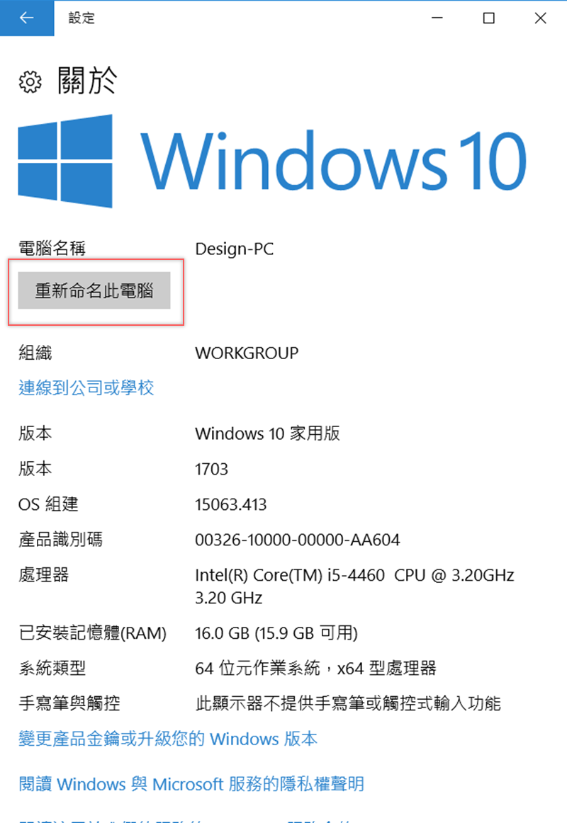 點「重新命名此電腦」即可,順便可以查看識別碼、處理器、記憶體,以及很多人都搞不清楚的系統類型(真的蠻多人會問自己系統是 32 還是 64 位元)。