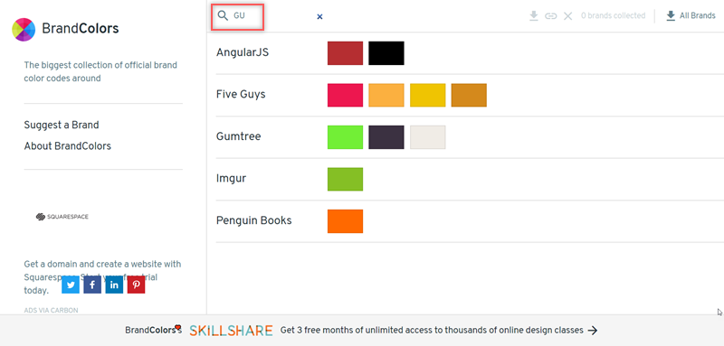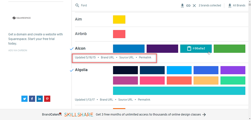 使用很簡單,首頁依英文字母排列名稱並列出一張張色票,可以看到像免費圖片網站 500px、軟體商 Adobe、訂房網站 Airbnb 都有收集。