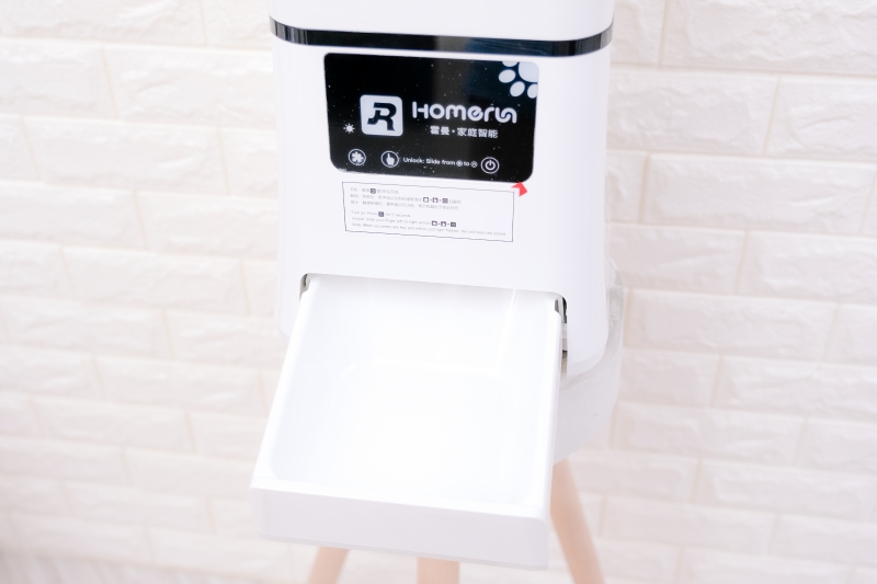 至於為什麼可以防破解呢,首先給大家看一下他出飼料的方式,是「自動伸縮」的,當放飯時間到的時候飼料盆才會推出來,然後你可以設定放飯後 10~60 分鐘再收回去(由你設定),或者不收也可以,都不影響下次放飯,然後這放飯的出孔位置是貓咪手怎麼伸都挖不了的地方,所以完全可以防範會挖飼料的貓咪,且飼料盆有卡榫,所以也不會被整個推出去,另外食盆可以伸縮有一個好處是,當吃完後收回去,也可以減少平常灰塵掉進碗裡的問題。