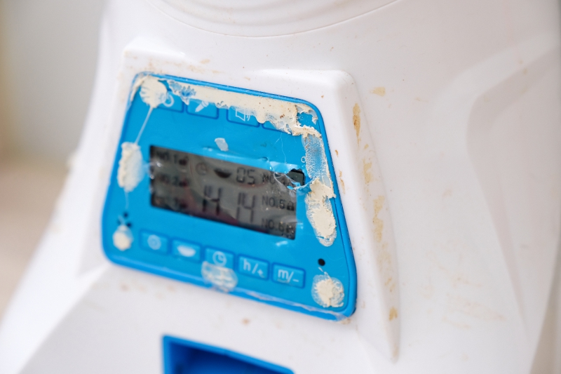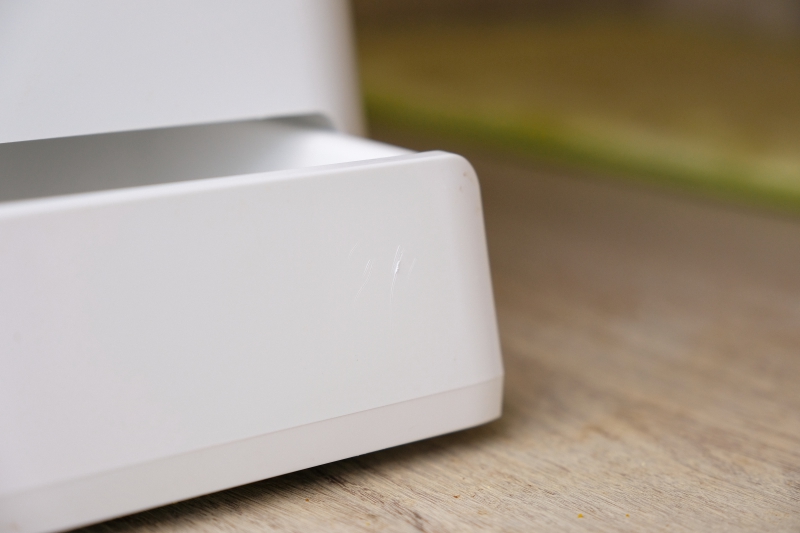 面板上白白的那個是我原本要防止他抓面板,所以自己裁了一片塑膠片黏上去的膠,已經是強力膠等級還是被他硬生生的弄了下來,所以再幾經考量之後,決定還是要換一台自動餵食器了。