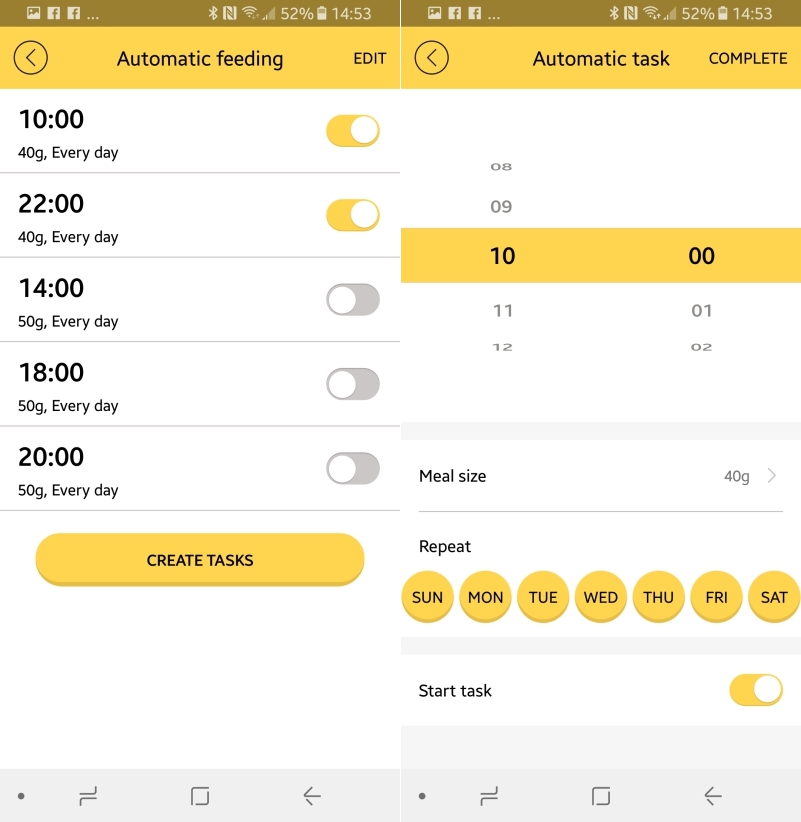 自動餵食設定的部份,可以自行增加非常多時段,而且可以依據不同的星期設定不同的放飯時間等,比起一般自動餵食器方便很多,放出的飼料同樣是用重量計算,不過就同樣的,記得自己也要量測一下,才能獲得較精準的放飯量。