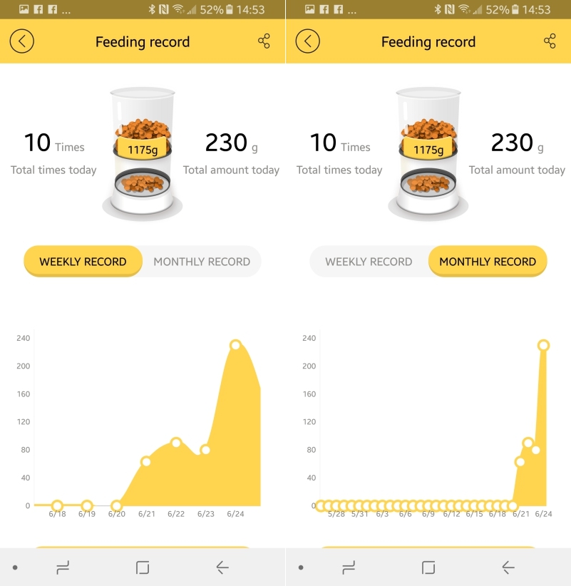 而每天餵食多少,有沒有放飯,只要看記錄就知道了,阿湯的圖表中有一天特別的多是因為那天在測試重量,才發現前幾天都給他吃太少,難怪餓到爆打餵食器啊。