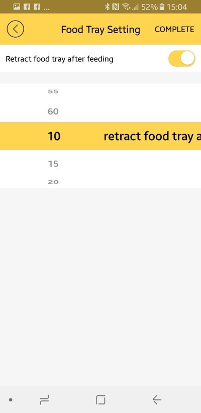 另外可以設定放飯後是否要收回飼料盆,最短可以設定 10 分鐘後,最長是 60 分鐘,阿湯那隻是餓死鬼投胎,每次都會在 2 分鐘內吃完飼料,所以我就設定了 10 分鐘。