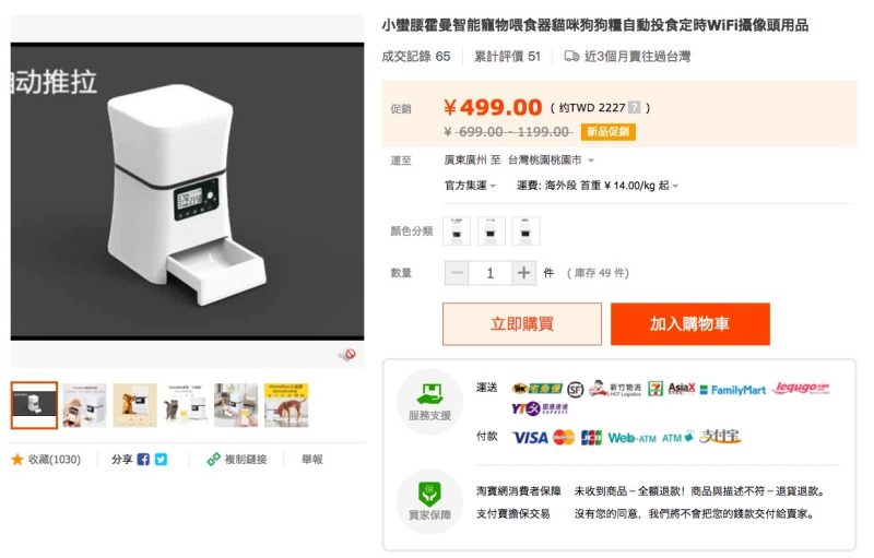 先分享一下我從哪邊購買的,以及運送方式給大家,自己購買的話,差不多含運 2700~2800 之間。這款自動餵食器一共有分三種版本,阿湯是購買最便宜的 Wi-Fi 基礎版,也就是沒有控制面板,全部都是透過 APP 來設定,另外最高階的還有雙向通話以及視訊鏡頭,但價格也是頗高的,大家可以自行參考網頁,店家有列出比較資訊。