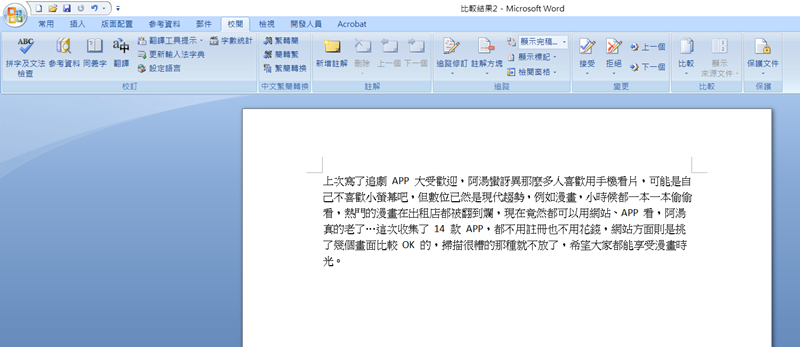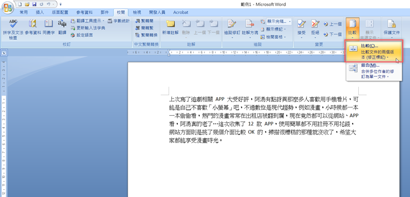 要運用這個隱藏版的小技巧其實非常簡單,先打開其中一份文件,到校閱頁籤,在下方找到「比較」,到第一個選項。