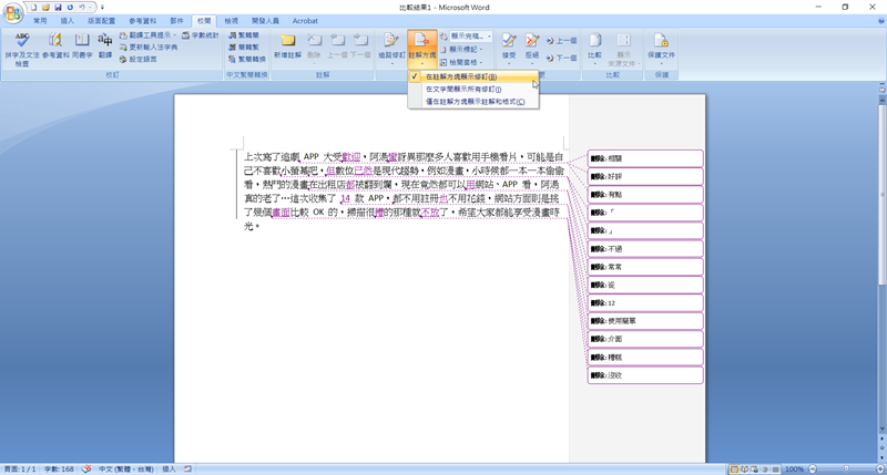 如果你要將有改過的檔案直接做成新文件,建議先關閉左右兩欄,然後在註解方塊選「在註解方塊顯示修訂」,就會以右邊欄一一顯示。