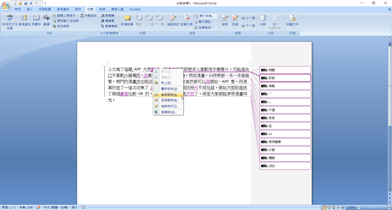 然後在每個修訂處點右鍵,看要接受或拒絕修訂的內容。