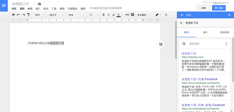 檔案右邊就會出現欄位顯示「就是教不落」在網頁、圖片、雲端硬碟的搜尋結果。
