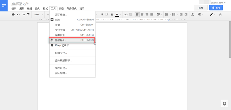 既然萬能的 Google 大神可以用語音輸入,那這項功能運用到相關的 Google 文件也不稀奇,在上方工具選「語音輸入」。