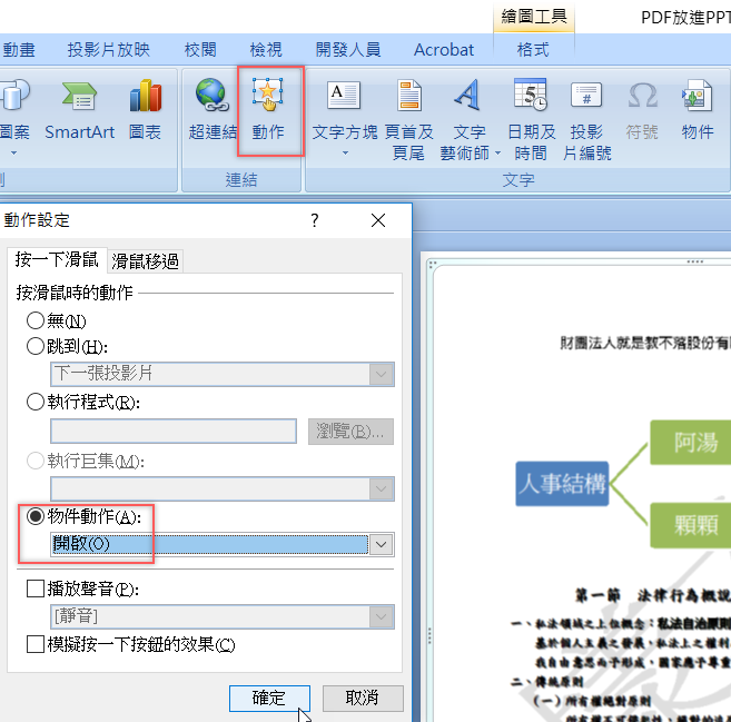 如果你的 PPT 版本或 PDF 閱讀軟體無法成功連結,就先點已插入的 PDF 檔,然後在上面找到「動作」,點開後選擇物件動作 → 開啟即可。
