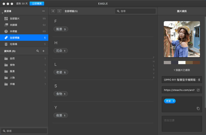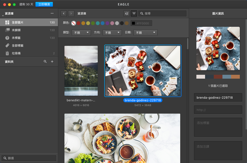 電腦用久了一定會收藏一堆圖片,如果沒有好好管理或是分類不確實常常會找不到,要用的時候要多花時間再尋找與拼湊,如果想重新從網路下載也怕找不到連結,或者下載了一堆同樣的圖片自己不知道…阿湯今天要介紹「Eagle」這個好用的圖片管理工具,使用資料夾、標籤、顏色等方式歸類與篩選,並提供擴充套件功能可輔助使用,繁體中文介面簡單好操作,使用習慣後要再找圖就輕易許多,很受設計行業的朋友喜愛。