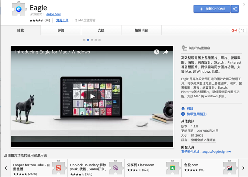 Eagle 也有 Chrome 擴充套件可使用,點右上角安裝。