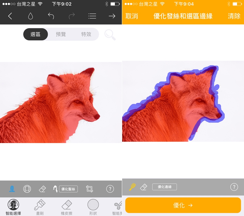 先用智能選擇,手指隨便畫幾條線就幫你選取紅色區塊,然後點「優化髮絲」,將邊緣畫一圈,進行優化。