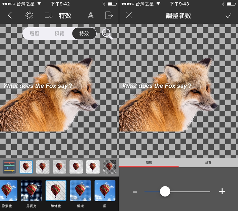 特效部分包括像素化、油畫、選區描邊、十字模糊、逕向色、浮雕、點光等四十多種,用個線條化好了,間隔與線寬還可做微調。