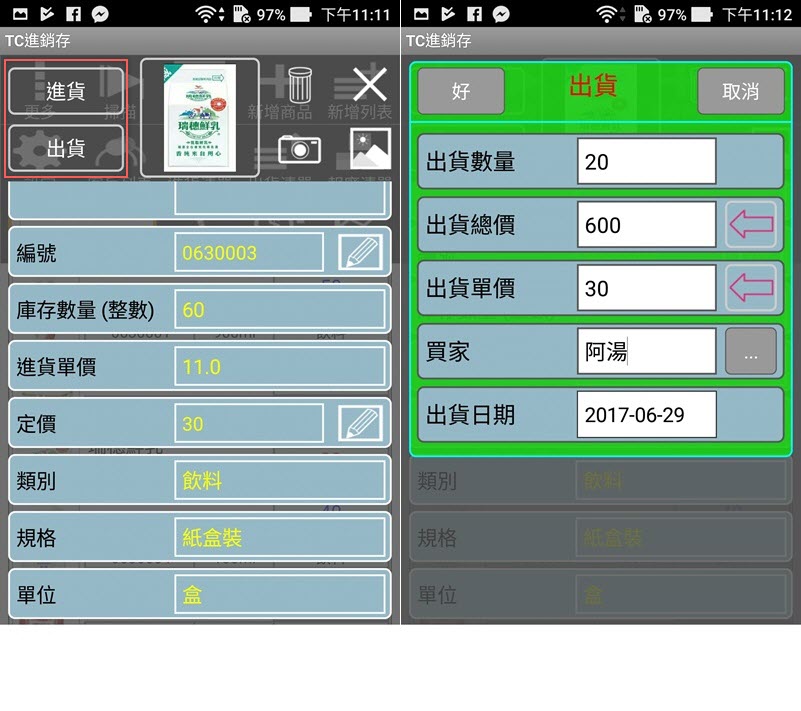 點進貨物,除了編號和定價可更改,其他都不能改,像阿湯規格寫錯就沒辦法改只能刪掉重加,假設現在要出貨,就點左上角進來輸入內容後送出。