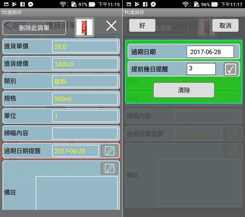 點進商品,可輸入過期日期,並設定幾日前提醒,生鮮商品應該很需要這功能。