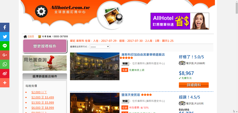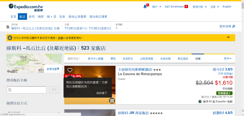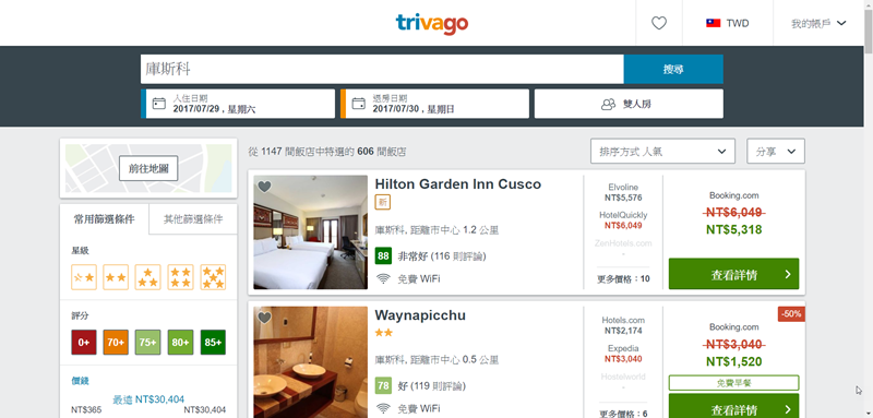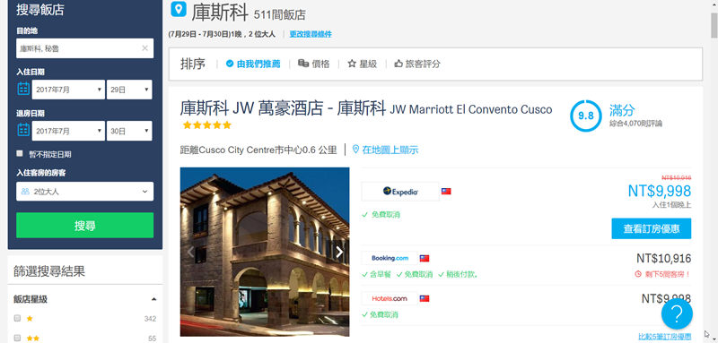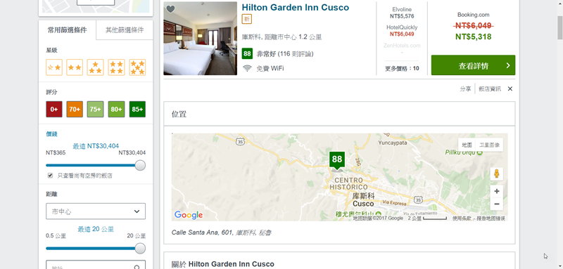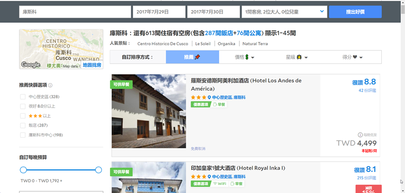 阿湯特別挑了一個不太熱門的地點來示範:秘魯,並以「庫斯科」城為主,那裡有世界文化遺產「印加帝國」的遺跡,並選擇一個月後的周六入住,首頁直接輸入住房資料,並看要不要依預算、評價、星級篩選。