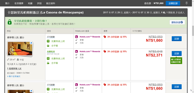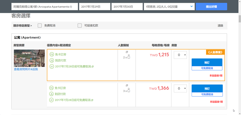 點進飯店名稱,除了豐富的設備和環境介紹外就是房型選擇,依不同方案訂房也有差別,有的也是在某個期限前可免費取消,付款機制也有分線上或當地。
