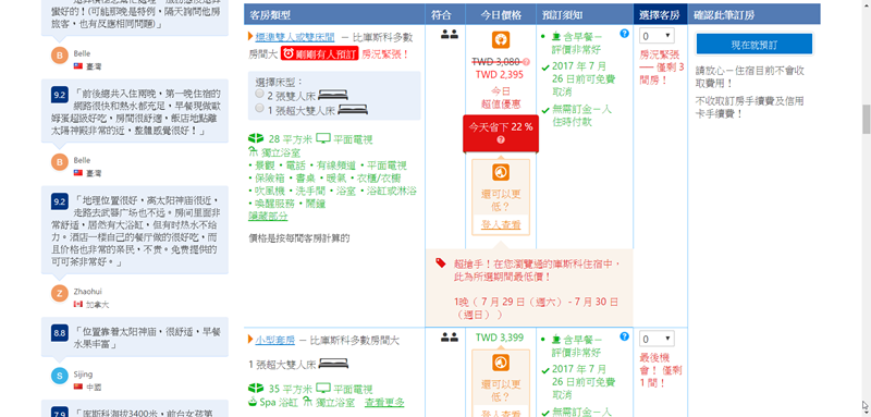 這次搜到的稍微少了點,共 398 間飯店和度假屋,第一項還有限時優惠,圖片旁依次顯示星級、距離、還有在「tripadvisor」的評論(下面會介紹),其他頁面功能都大同小異。