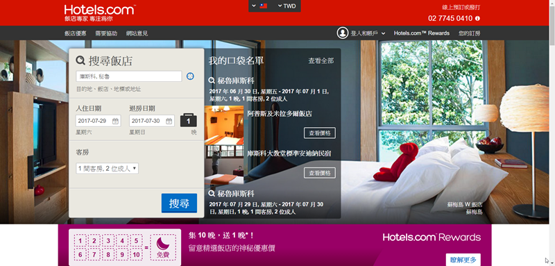 首頁編排有點花,除了左邊的訂房資訊輸入外,還有訂機票、租車連結,往下滑也有一些熱門和推薦的地點,十分豐富。