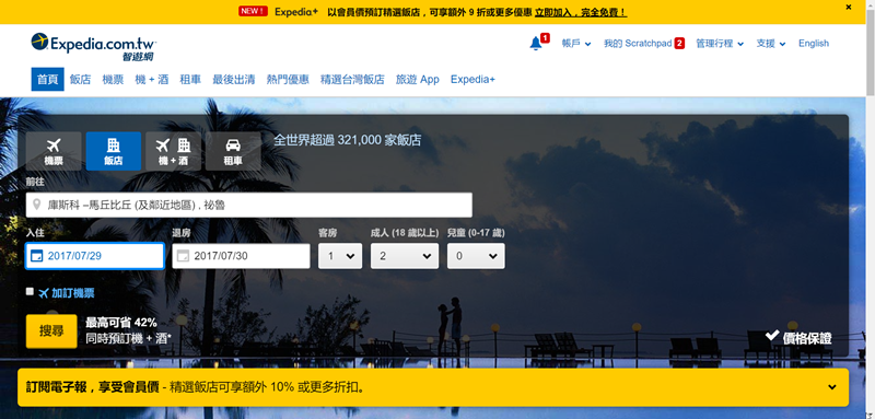 首頁除了訂飯店,還可切換到訂機票、機加酒、租車,阿湯介紹的網站都有會員機制,大家要訂的時候記得要加會員價格應該會更便宜。