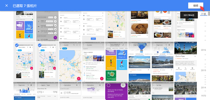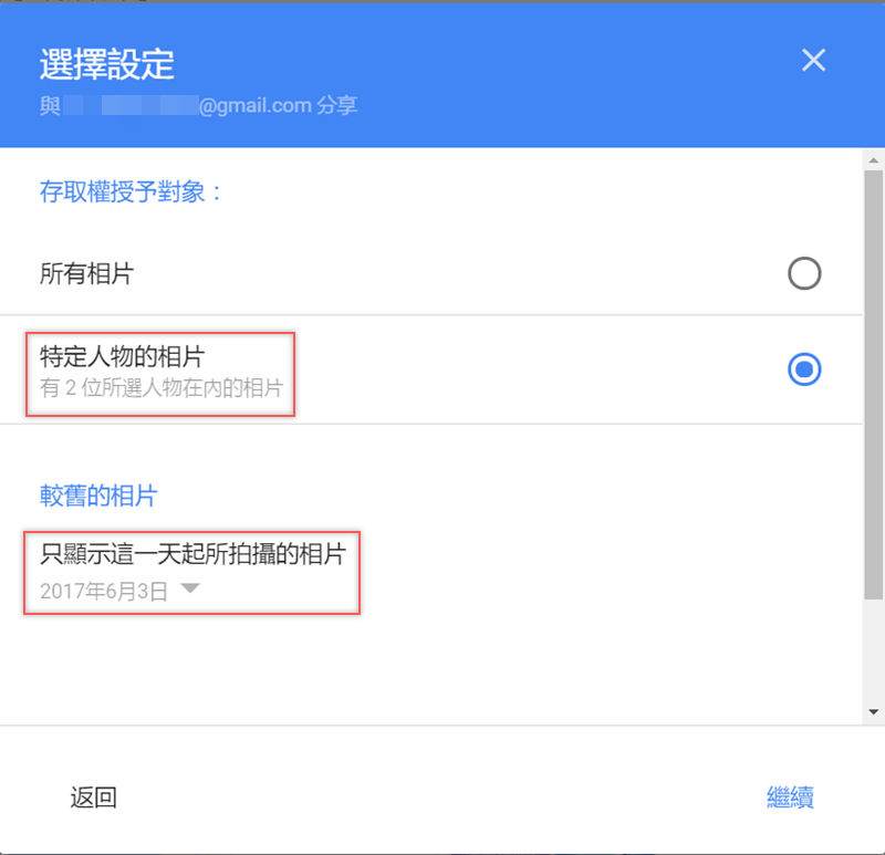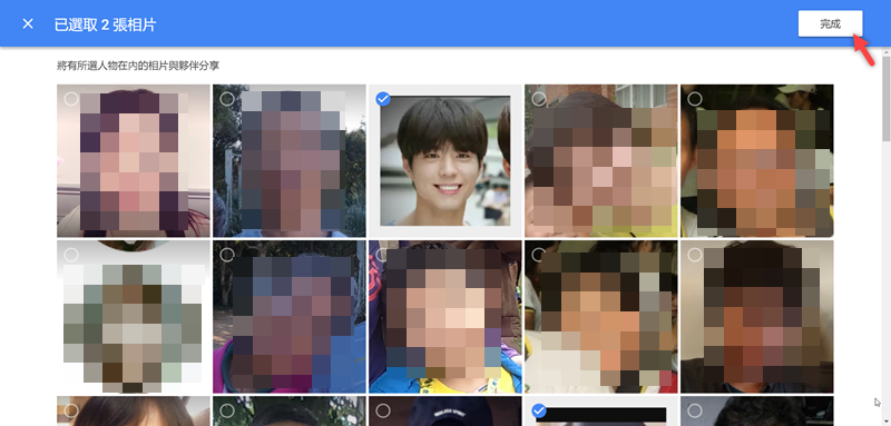 繼續後可選擇所有相片、特定人物的相片、或是在某一天起拍攝的相片,例如特定人物,這裡蠻好玩的是 Google 會智慧辨識在相簿中的所有「人」,包括卡通人物,但不包括動物等非人類。