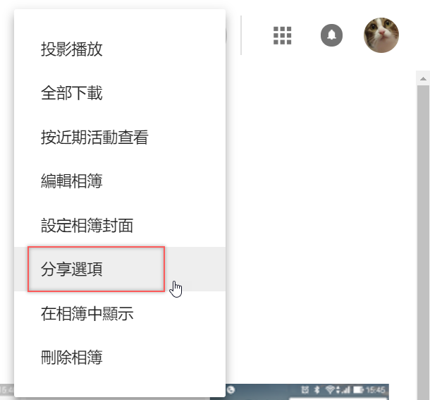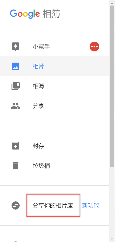 另一個功能要回到 Google 相簿首頁,打開左上角選單找到「分享你的相片庫」。