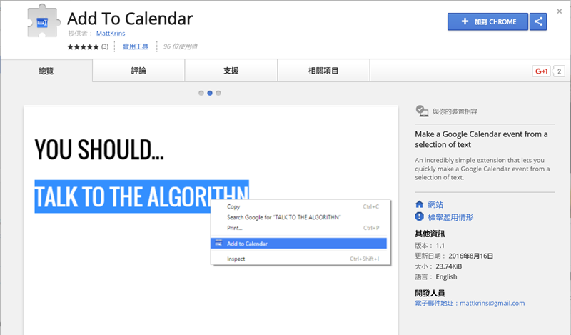 步驟非常簡單,先到擴充套件首頁點「加到 CHROME」。