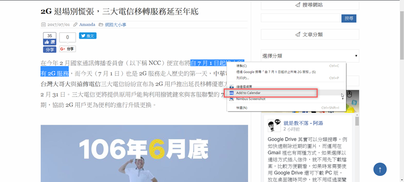 然後你隨時看到什麼需要加入的事項,例如阿湯在網站上看到 2G 即將退場的消息,就將關鍵字句反白,滑鼠右鍵點「Add To Calendar」。
