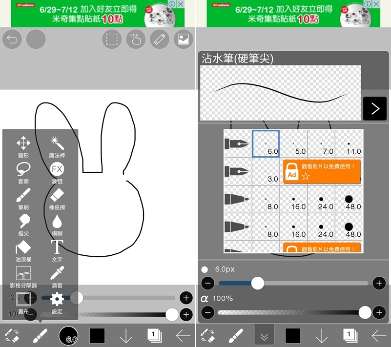 原諒阿湯沒什麼繪畫天分只能簡單示範,相信大家都比我厲害的多,下排是功能列,可切換筆刷和橡皮擦,並有套索、指尖、油漆桶、影格分隔器等多功能選項,其中光筆刷就有上百種,透明度與粗細都可調整,有的要看 20 秒廣告解鎖。