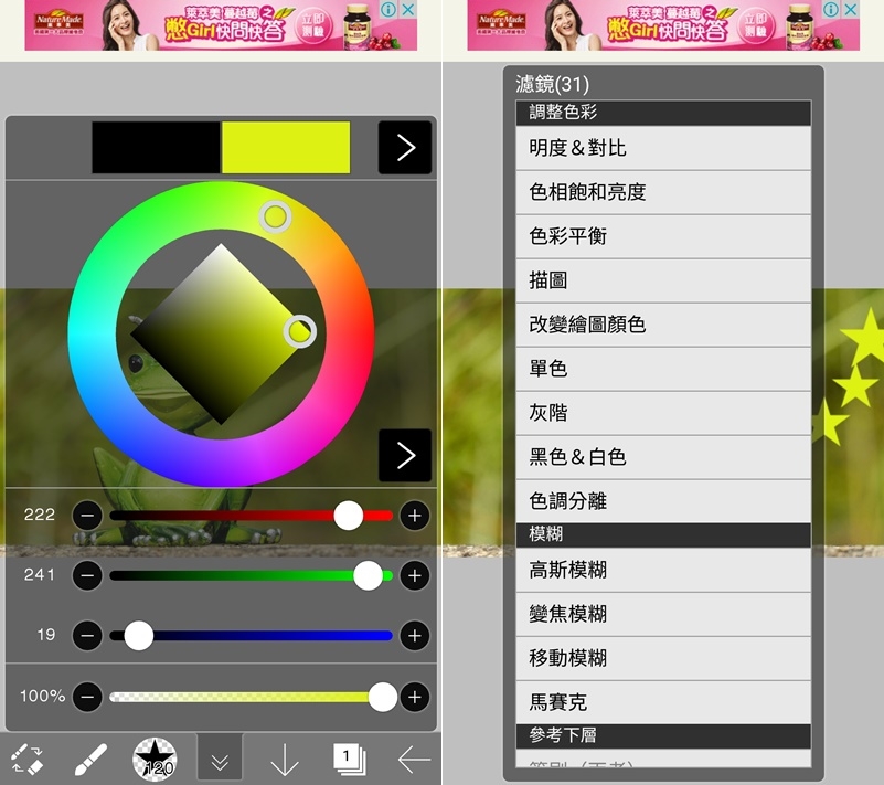 背景素材也能選擇以不同形式加入,其實 APP 裡很多功能阿湯都沒聽過也不太會用,所以最後只能弄個插畫風的青蛙,有接觸過相關軟體的人一定知道怎麼用啦,阿湯就不獻醜了。