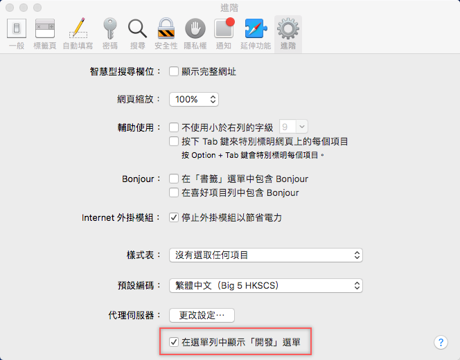 勾選「在選單列中顯示開發選單」。