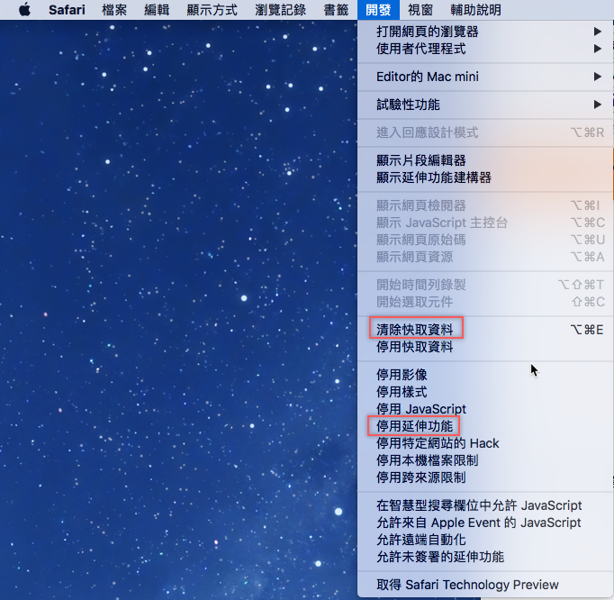 然後「開發」就會出現在上排,打開後點「清除快取資料」到完全清空後,再點「停用延伸功能」。