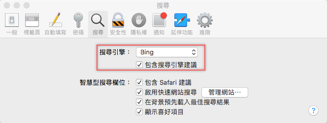 第五種是更改搜尋引擎,在 Safari 打開偏好設定,將引擎改成「Bing」再重新啟動 Safari,試試看有沒有比預設的 Google 要快,還可以取消勾選「搜尋引擎建議」等五個選項,有時候是會變慢是因為這些額外的次要功能。