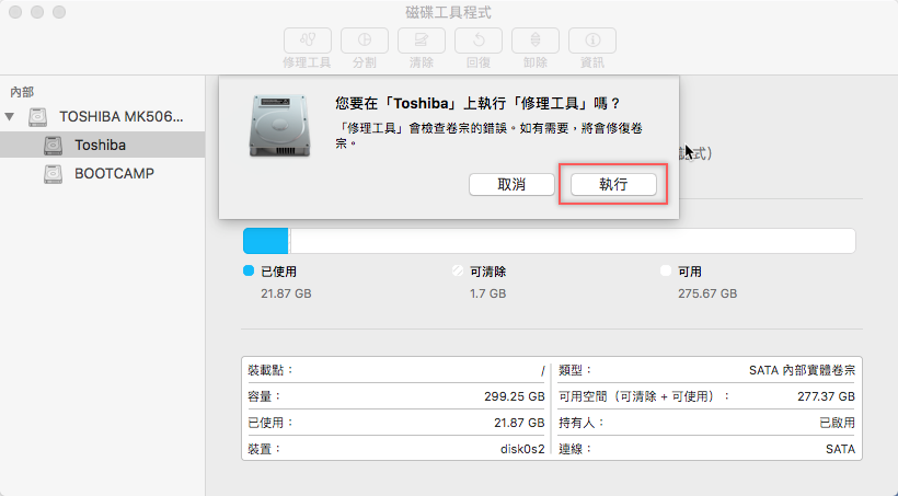 選擇要修復的磁碟,點執行就會開始修理。