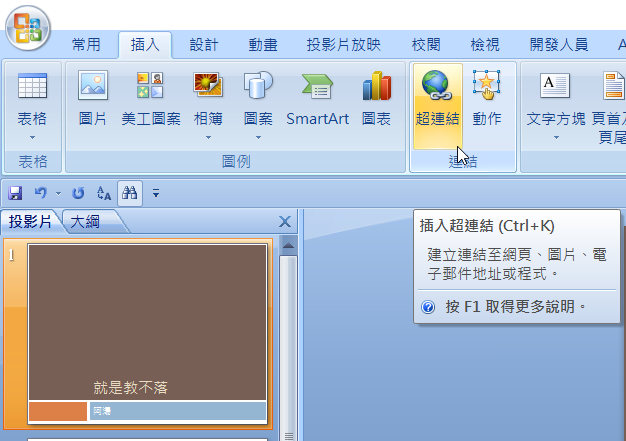 先示範最簡單的,將其他 PPT 檔案使用超連結插入,先到要處理的投影片,選擇插入 → 超連結。