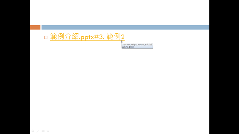 測試看看,播放投影片,成功的話點超連結就會連到「範例 2」那張,不會從頭開始(這篇介紹的超連結都只能在「播放模式」下才會發揮作用)。