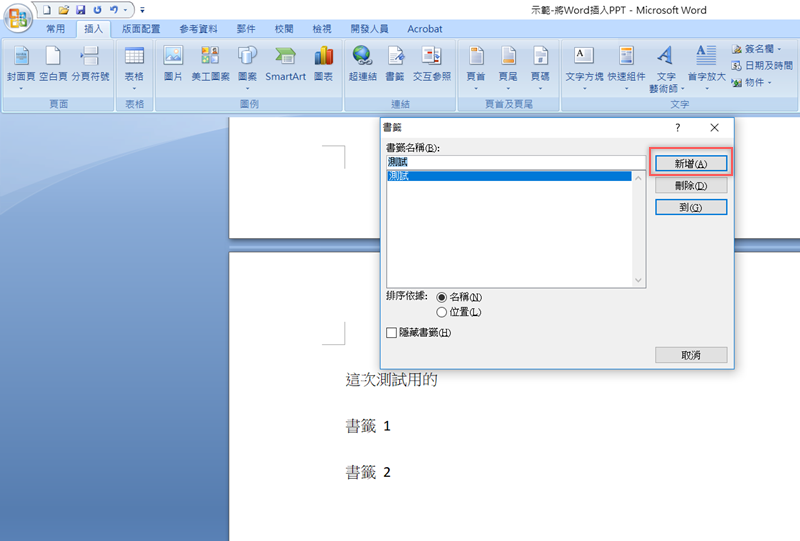 這時候你要先到 Word 檔,滑鼠游標移到要當作書籤的地方,然後點插入 → 書籤,隨便輸入一個名稱後新增。