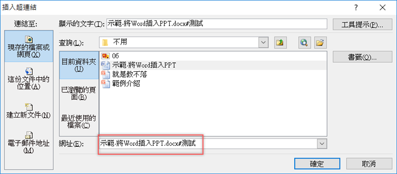 再回到 PPT 檔,選擇剛剛的那份 Word 檔之後,在檔名後面加上「# 書籤名稱」,這樣子當你開啟連結顯示的就會是剛剛插入書籤的地方。