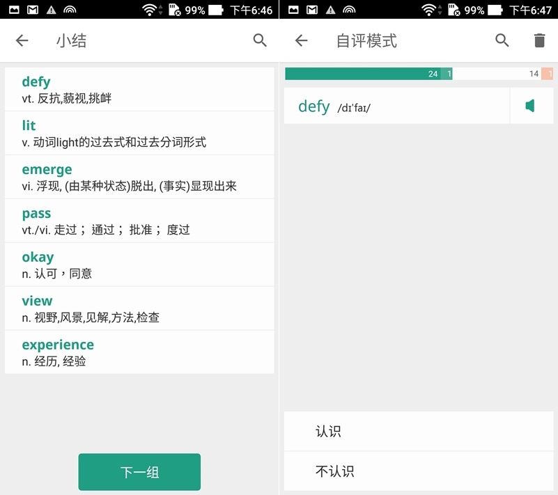 一組一組學習下來,前面點不認識的單字會隨機出現,加深印象,讓你慢慢認識。