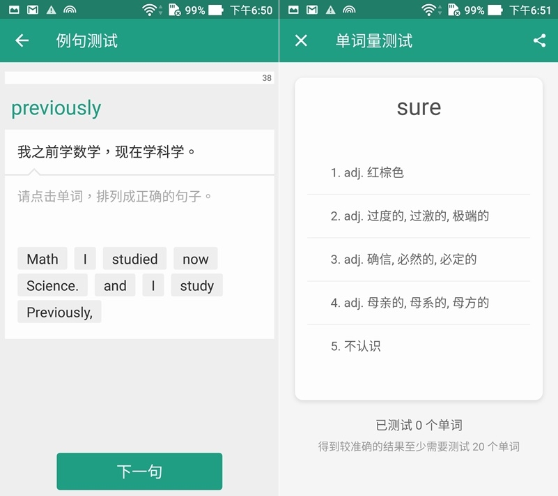 例句測試是以點單字重新排列的方式,單詞量測試則是出現單字後選擇中文翻譯。