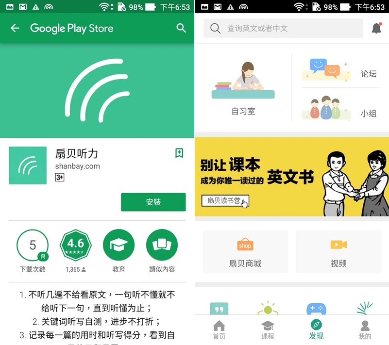 首頁關於口語、聽力、閱讀、煉句的部分,都要另裝其他 APP 才能使用,另外可在「發現」區加入小組學習,共同督促與分享心得。