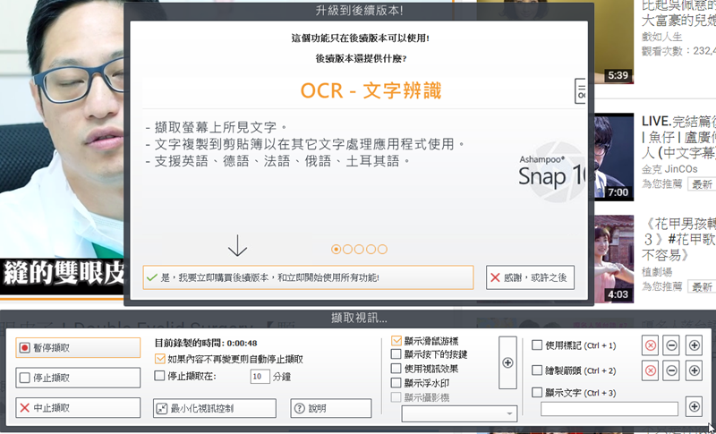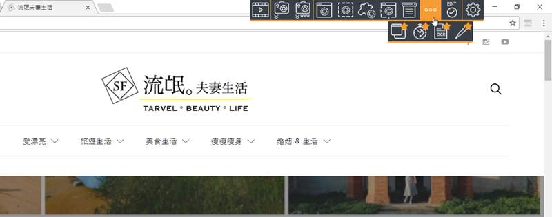 開啟後會以懸浮視窗貼在右上角,滑鼠接近便會顯示,有擷取視訊、捲動視窗、網頁、任意樣式等功能,標示星號的是進階付費功能,例如計時擷取、多重視窗等。